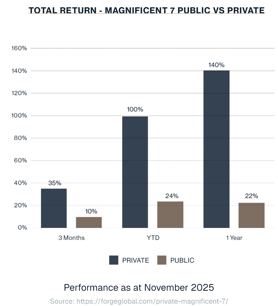 The Private Magnificent 7 companies have generated a 140% return in the last 12 months, outperforming their “Public Magnificent 7” counterparts by 118%